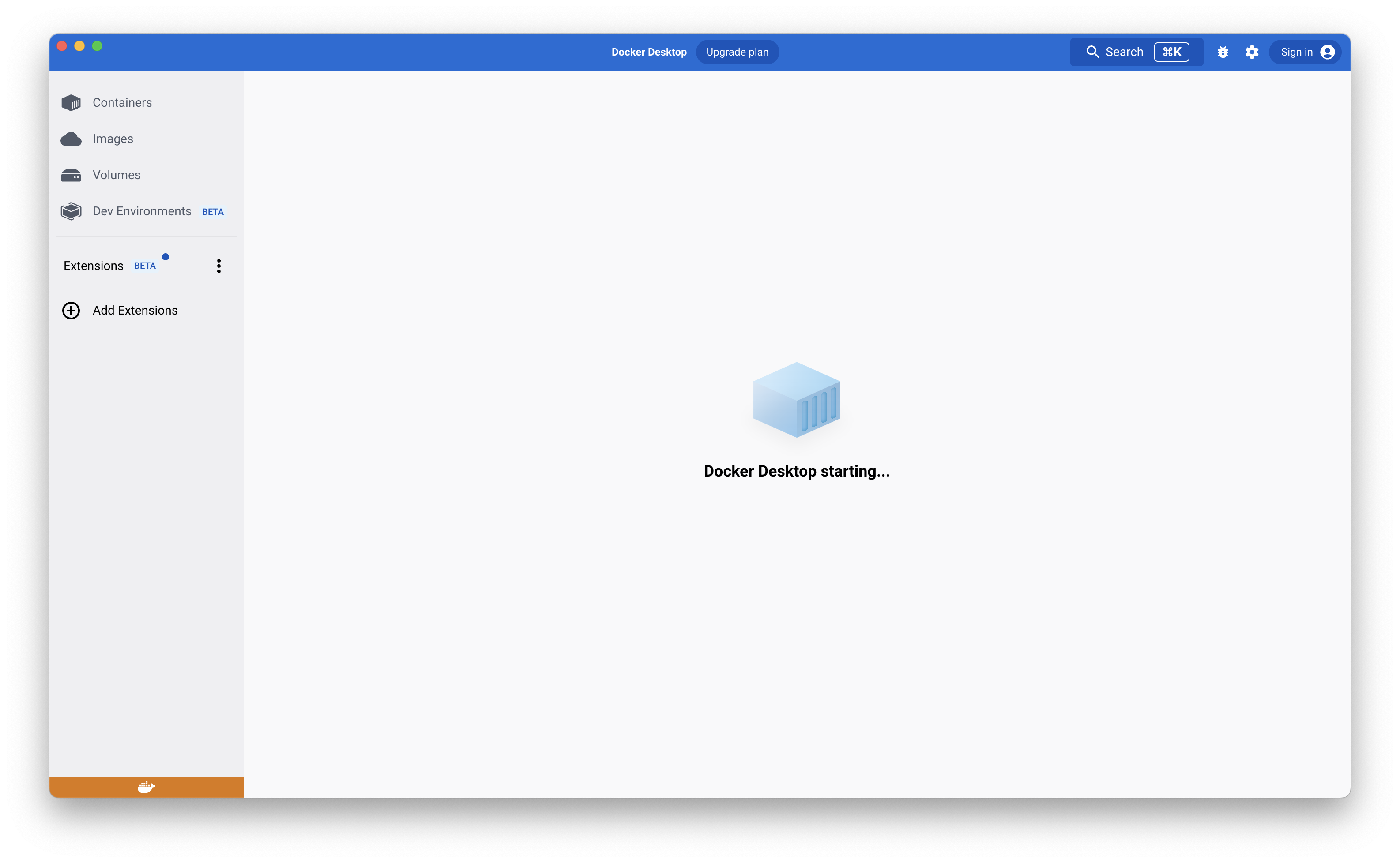 설치 후에 Docker Desktop을 실행하면 이렇게 Docker Desktop starting…이 나타난다. 잠시 기다리면 로딩이 완료되어 Docker가 실행되어 있는 상태가 되는데, 상단 상태표시바에 아래와 같이 확인할 수 있다.