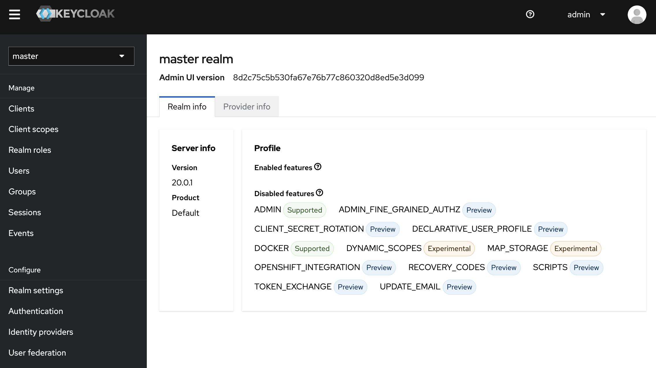 docker run -p 8080:8080 -e KEYCLOAK_ADMIN=admin -e KEYCLOAK_ADMIN_PASSWORD=admin quay.io/keycloak/keycloak:20.0.1 start-dev